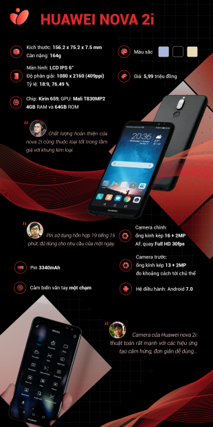 Tất nhiên, là một chiếc máy ở tầm trung nên thiết kế cũng như hoàn thiên của nova 2i không phải quá xuất sắc như những máy dòng P, dòng Mate của hãng, dù vậy thì cũng thuộc loại khá tốt trong tầm giá. Bên dưới đây là chi tiết hơn xíu các thông số kỹ thuật cũng như một vài trải nghiệm của bọn mình về chiếc máy này. Mời anh em xem infographic.