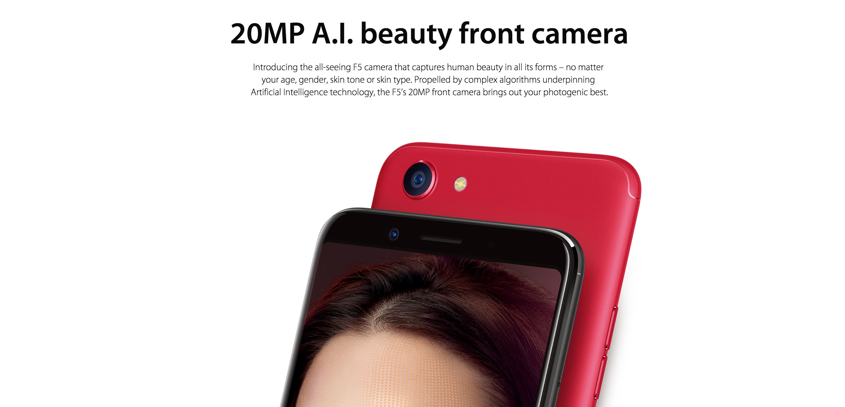 Cũng như các phiên bản trước đây, camera mới chính là trọng tâm của OPPO F5. Camera sau của máy có độ phân giải 16MP với khẩu độ f/1.8. Camera trước có độ phân giải đến 20 MP, khẩu độ f/2.0, kích thước cảm biến khá lớn, lên đến 1/2.8. Về phần mềm, OPPO tích hợp tính năng làm đẹp bằng trí tuệ nhân tạo. Cơ bản thì AI của F5 sẽ điều chỉnh các chi tiết trên khuôn mặt như mắt, mũi, cằm, má,... sao cho hài hòa và nổi bật nhất, tất nhiên, chế độ chụp selfie xóa phông cũng có mặt trên chiếc smartphone này.