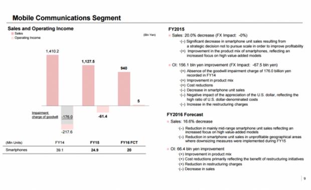 Theo đó, doanh số smartphone kỳ vọng cho năm 2016 và Q1/2017 sẽ giảm khoảng 20% về số lượng máy đưa ra thị trường nhưng đặc biệt là lợi nhuận công ty vẫn sẽ tăng thay vì thua lỗ như năm ngoái. Hãng điện thoại Nhật Bản nói rằng sự sụt giảm dự kiến doanh số bán hàng là do 'họ sẽ tập trung nhiều hơn vào các sản phẩm có lợi nhuận cao cùng với đó là tinh giản biên chế trong năm tới'.