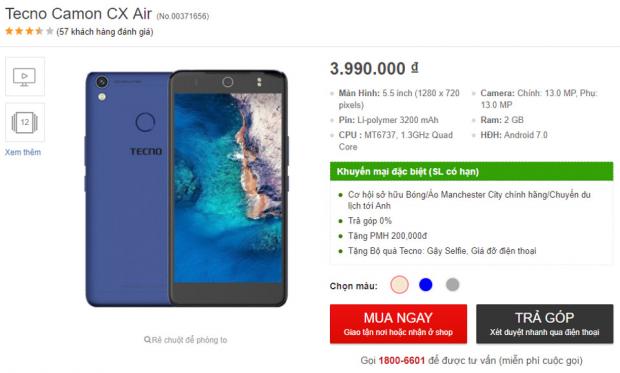 TECNO Camon CX Air là chiếc smartphone phổ thông có nguồn gốc từ Hong Kong, sở hữu nhiều ưu điểm như thiết kế nguyên khối chắn chắn, bộ đôi camera 13MP chụp ảnh ấn tượng và hiệu năng mượt mà. Đặc biệt hơn nữa khi mức giá của Camon CX Air chỉ là 3.99 triệu đồng!