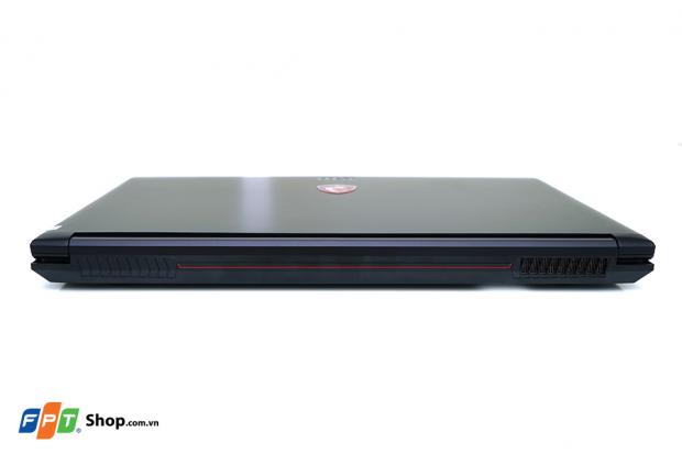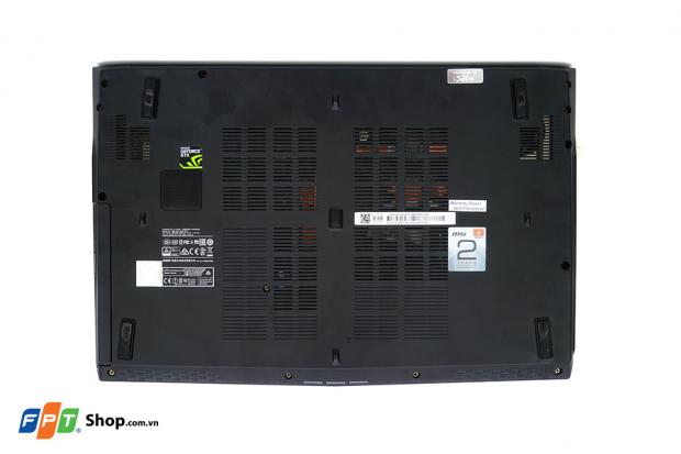 Ngắm nhìn mặt sau các bạn sẽ thấy MSI bố trí rất nhiều các khe thông hơi để nhằm đảm bảo sự thoát nhiệt nhanh chóng nhất có thể khi bạn chơi game nặng. Cặp loa Stereo cũng được đặt ở phía mặt dưới laptop trong khi đó quạt tản nhiệt được đặt lệch về bên trái cạnh trên.