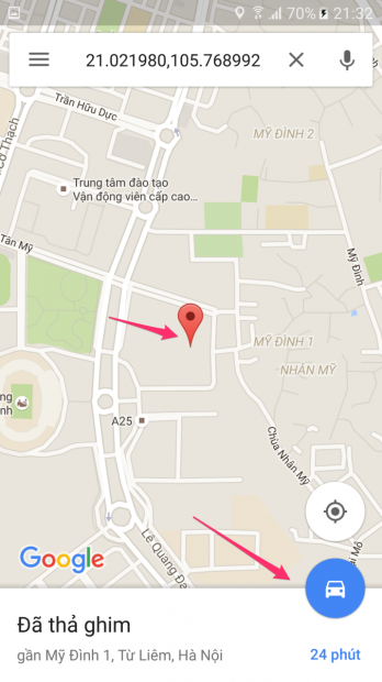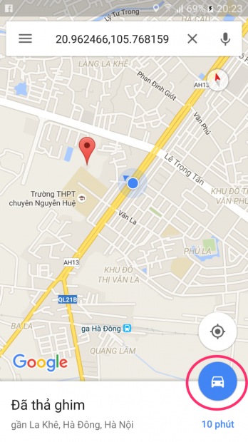 Mở ứng dụng Google Maps Tìm địa điểm bạn muốn đến, nhấn giữ trên bản đồ. Một biểu tượng chiếc xe con sẽ xuất hiện với thông tin về địa điểm đã đánh dấu. Nhấp vào vào phím điều hướng để Google Maps chỉ dẫn đến điểm bạn chọn