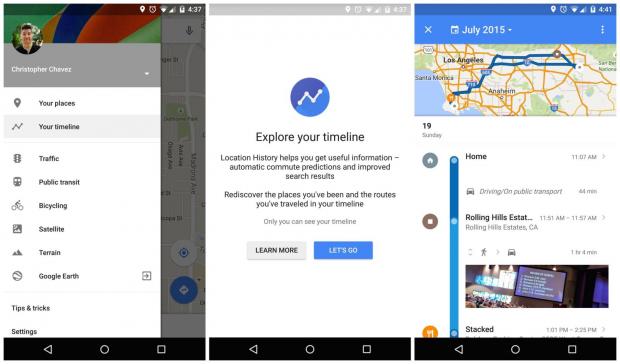 Chức năng mới trong Google Maps là timeline (dòng thời gian). Google cơ bản biết những nơi bạn ghé qua ở bất cứ lúc nào, điều này có trong khi bạn dùng các sản phầm của Google như Maps. Chúng dùng các thông tin ấy trong để giúp bạn dễ dàng hơn, gần đây Google sử dụng điều này để khiến lịch sử địa điểm đã ghé thăm của bạn dễ dàng truy cập hơn trong timeline
