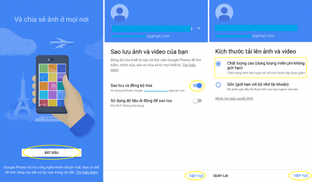Sau khi cài đặt xong ứng dụng sẽ yêu cầu bạn đăng nhập bằng tài khoản gmail. Tiếp đến bạn bật chế độ sao lưu và đồng bộ hóa, còn về phần 'sử dụng dữ liệu di động để sao lưu' tức là những khi máy bạn không có kết nối wifi thì sẽ đồng bộ qua kết nối mạng 3G hoặc 4G.
