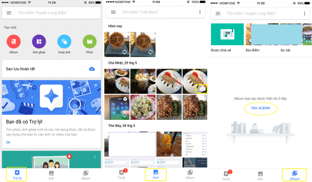 Khi thiết lập xong những tùy chọn bạn sẽ thấy giao diện Google Photos gồm 3 mục: trợ lý, ảnh và album.