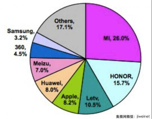 Biểu đồ trên được chia sẻ bởi CEO Lei Jun của Xiaomi, dựa trên nghiên cứu và các báo cáo phân tích thị trường hàng tháng ở Trung Quốc. Xếp sau Xiaomi lần lượt là Honor (một công ty con của Huawei) với 15,7%, Letv với 10,5 % và Apple 8,2%. Có vẻ như “gã khổng lồ” Samsung không mấy được quan tâm ở Trung Quốc khi chỉ chiếm được vỏn vẹn 3,2% thị phần. OPPO rất nổi tiếng ở Việt Nam và các nước phương Tây nhưng lại hoàn toàn lép vế ở thị trường nội địa khi thậm chí còn không xuất hiện trong biểu đồ.