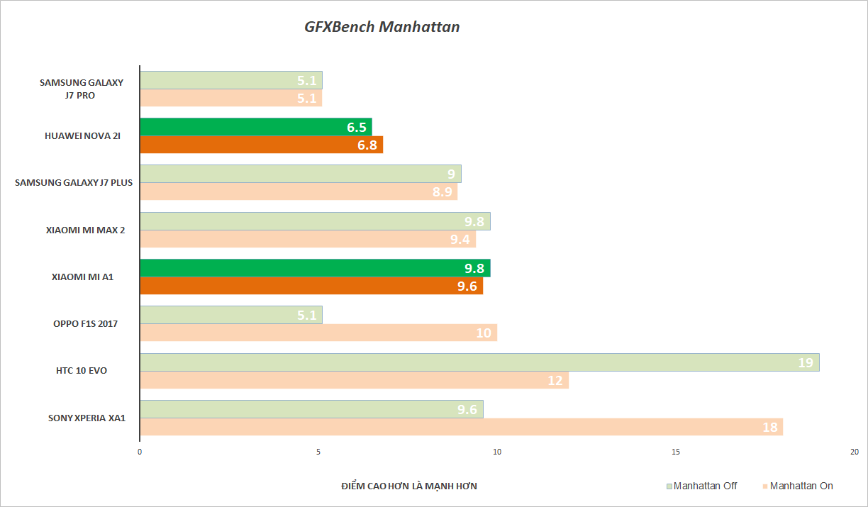 Ở bài đo Antutu, điện thoại của Xiaomi thể hiện tốt hơn ở điểm đồ hoạ 3D và điều này tiếp tục lặp lại trên bài đo Manhattan của phần mềm GFX Bench. Ở bài đo này, phần mềm sẽ đo khả năng xử lý đồ hoạ ở độ phân giải thực của máy (onscreen) và độ phân giải tiêu chuẩn (offscreen) là Full-HD. Kết quả máy nào cho ra điểm cao hơn là mạnh hơn.