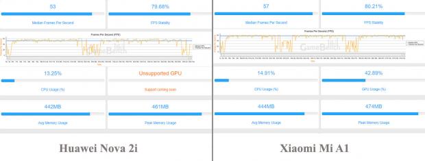 Sự chênh lệch lớn như vậy khá bất ngờ, có thể đến từ việc Nova 2i không thể tận dụng tối đa phần cứng để xử lý game. Theo báo cáo từ GameBench thì CPU trên Nova 2i trung bình chỉ sử dụng 13,81%, thấp hơn nhiều so với 29,88% trên Mi A1. Ứng dụng này chưa tương thích với GPU Mali-T830 trên Nova 2i, nhưng ở Mi A1 thì GPU sử dụng đến 83,94%.