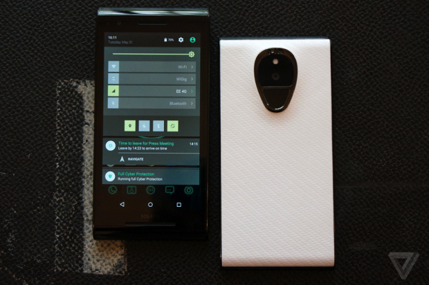 Được biết, chiếc điện thoại Solarin được thiết kế dành riêng cho những doanh nhân muốn giữ kín bí mật kinh doanh của mình. Để làm được điều nó, máy sử dụng công nghệ mã hóa cấp quân đội để ngay cả khi máy bị mất thì đối thủ cạnh tranh cũng không lấy được bất cứ thông tin nào. Bên cạnh đó, nó còn sở hữu một cần gạt đặc biệt để kích hoạt chế độ bảo mật cao khi nghe gọi hoặc gửi tin nhắn. Mặt sau máy được trang bị cụm camera với thiết kế hình giọt nước có độ phân giải 23,8MP, đi kèm đó là chức năng lấy nét laser và cảm biến vân tay ngay phía dưới.
