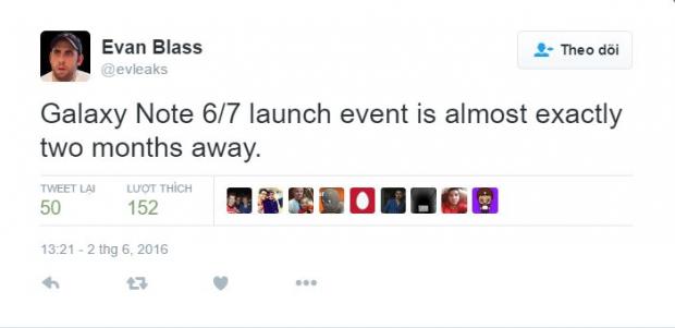Tháng trước, chúng tôi nghe nói rằng chiếc Galaxy Note mới (6 hoặc 7, hoặc một tên gọi nào khác) có thể được phát hành tại Mỹ trong tuần bắt đầu từ ngày 15/8. Và hôm nay, Evan Blass (tài khoản @evleaks) báo cáo rằng sự kiện ra mắt thiết bị cầm tay này sẽ diễn ra trong hai tháng nữa – có nghĩa là chúng ta có thể mong đợi Samsung chính thức công bố một model Note mới vào những ngày đầu tiên của tháng Tám. Evan Blass vốn được biết đến là người chuyên đưa các thông tin rò rỉ khá chính xác và do vậy chúng ta hoàn toàn có thể hy vọng về điều này.