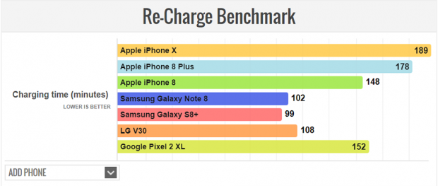 Thời gian sạc của iPhone X cũng lâu hơn so với các đối thủ Android. Cụ thể, với củ sạc đi kèm theo máy thì sản phẩm đến từ Apple mất tới 189 phút mới sạc đầy trong khi Galaxy S8 Plus chỉ mất 99 phút còn Samsung Galaxy Note 8 mất 102 phút để sạc đầy.