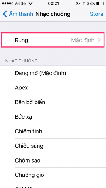 B3: Nhấp chọn vào mục 'Rung' nằm ngay hàng đầu tiên