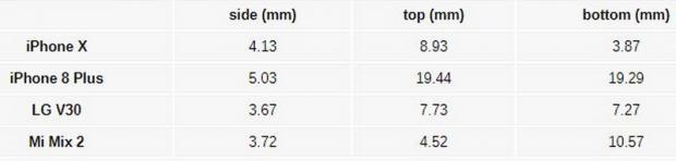 Viền cạnh 2 bên của iPhone X dày 4.13 mm, mỏng hơn gần 1 mm so với iPhone 8 Plus. Tuy nhiên nó vẫn không mỏng bằng LG V30 (3.67 mm) và Mi MIX 2 (3.72 mm).