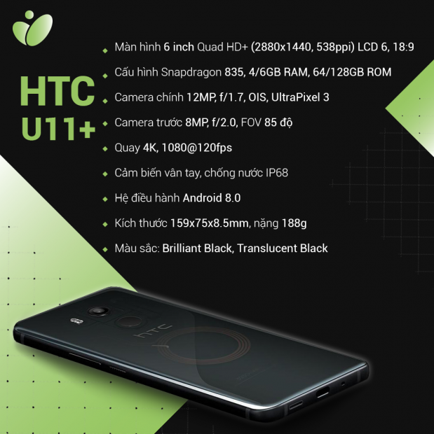 HTC U11 Plus về cấu hình vẫn giống HTC U11 với Snapdragon 835 cung hai bản có dung lượng RAM là 4GB và 6GB tương ứng với hai bộ nhớ lưu trữ trong là 64GB và 128GB. Chưa rõ bản bán ở Vn sẽ là bản 128GB hay 64GB. Mình từng trải nghiệm HTC U11 bản VN 6GB RAM trong vài tháng và đánh giá đó là chiếc Android mượt mà và nhanh.