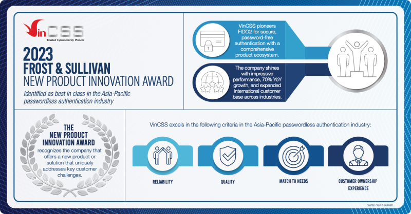 SAN ANTONIO, Oct. 09, 2023 (GLOBE NEWSWIRE) -- Following a research of the passwordless authentication landscape, Frost & Sullivan has awarded VinCSS the 2023 Asia-Pacific New Product Innovation Award. Based in Ho Chi Minh City, Vietnam, VinCSS stands out as a pioneer in leveraging FIDO2 standards for passwordless authentication, focuses on providing cybersecurity solutions for IT, IoT, and Automotive.