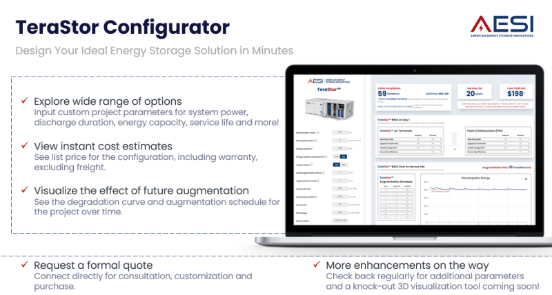 “The TeraStor Configurator is a game-changer for anyone evaluating various options for this efficient and reliable energy storage solution,” said Bud Collins, CEO of AESI. “We believe that everyone deserves the power to harness the potential of clean energy, and this tool makes it easier than ever before to estimate the right TeraStor configuration for their specific project’s needs.”