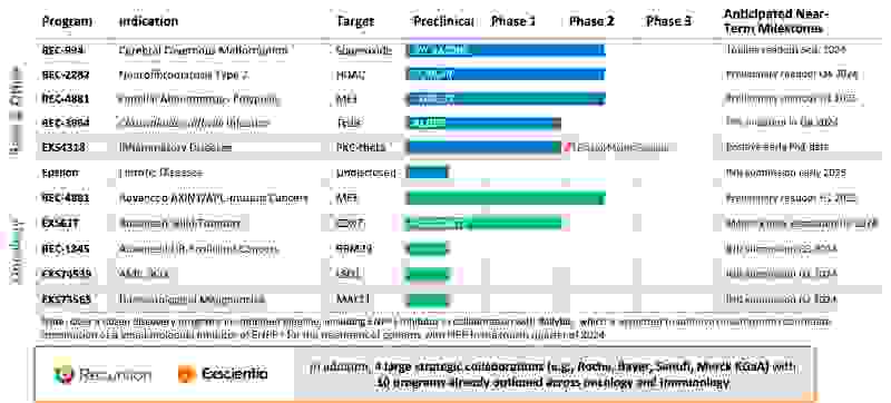 - Partnerships: The proposed business combination would bring together transformational partnerships with leading large pharma companies with a total of 10 programs already optioned across oncology and immunology. In addition to Recursion’s transformational partnerships with Roche-Genentech (neuroscience and a gastrointestinal oncology indication) and Bayer (undruggable oncology), Exscientia has partnerships with Sanofi (immunology and oncology) and Merck KGaA (oncology and immunology). In addition, Exscientia has a partnership with BMS (oncology and immunology) where an optioned program related to PKC-Theta has already shown positive early Phase 1 results. Furthermore, the combined company expects potential additional milestone payments of approximately $200 million over the next 2 years from its current partnerships.