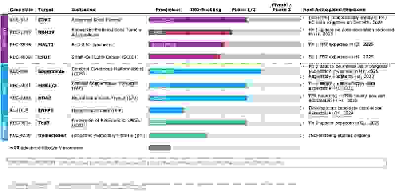 - REC-3565 (MALT1 inhibitor, B-Cell Malignancies): Phase 1 first patient dosed (FPD) expected in Q1 2025