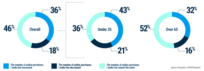 LONDON and ATLANTA, May 14, 2025 (GLOBE NEWSWIRE) -- Descartes Systems Group (Nasdaq:DSGX) (TSX:DSG), the global leader in uniting logistics-intensive businesses in commerce, released findings from How Smarter Home Delivery Wins Younger Consumers as Online Buying Slows, its fourth annual consumer sentiment study of ecommerce home delivery. The study shows that, in a slower growing ecommerce market, consumers aged 18-35 (“under 35s”) are the biggest contributor to online growth, increasing both the volume and frequency of their purchases over the last 12 months compared to the prior year. While 18% of overall consumers surveyed cut back on purchases during this period, 43% of under 35s increased their spending year-on-year compared to just 32% of over 65s (see Figure 1).