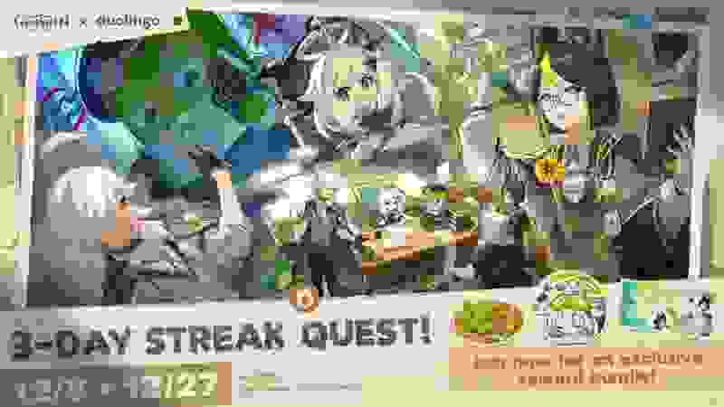 The 'Genshin Impact x Duolingo 3-Day Streak Quest' will be available in select regions from December 8 to December 27. December 25 is the last day for learners to join the Quest and earn rewards. Event availability varies by region. Learners can check participation details for their region in the Duolingo app. For more details, please visit https://www.duolingo.com/help/genshin-impact.