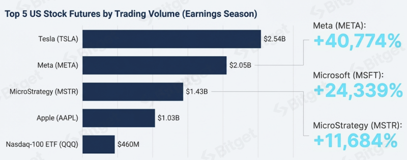 Futures markets experienced extraordinarily aggressive trading behavior centered around mega-cap technology stocks, with Tesla, Meta, MicroStrategy, Apple, and the Nasdaq-100 ETF (QQQ) dominating activity. Meta’s futures volume increased 40,774%, Microsoft 24,339%, and MicroStrategy 11,684% MoM, reflecting traders’ efforts to capture earnings-driven volatility and AI-related momentum.