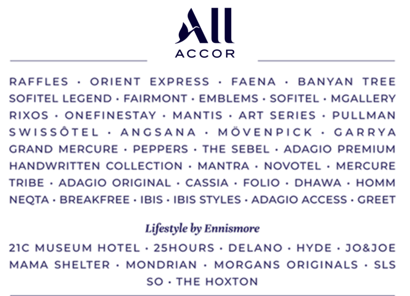 ALL Accor is a booking platform and loyalty programme embodying the Accor promise during and beyond the hotel stay. Through the ALL.com website and app, customers can access an unrivalled choice of stays from more than 45 Accor brands in 110 countries, always at the best price. The ALL Accor loyalty programme gives members access to a wide range of rewards, services and experiences, along with over 100 renowned partners. ALL Accor supports its members daily, enabling them to live their passions with over 7,000 events worldwide each year: local activities, chef masterclasses, major sports tournaments and the most eagerly awaited concerts. ALL Accor is the loyalty programme preferred by travellers.