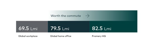 Leesman, the global leader in independent workplace research, has quantified exactly what makes a commute 'worth it.' Through its independent workplace experience assessment, Leesman captures employee sentiments on how effective their work environments are at supporting them, benchmarking these results against the Leesman Index, a global database of over 1.5 million employee responses. The global average workplace experience score (Lmi) is 69.5, while the global benchmark for the homeworking experience (H-Lmi) is 79.5. Framery's Tampere HQ scored an Lmi of 82.5 which puts it in the global elite of workplaces.