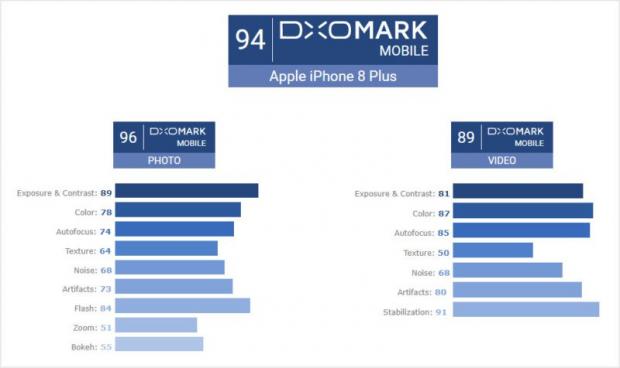 Với điểm số 94, iPhone 8 Plus đã bỏ qua các đối thủ phía sau là iPhone 8, Google Pixel và HTC U11.