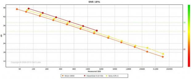 3 tiêu chí để quyết định điểm ISO của DxO Labs là so sánh với 18-bit màu, 9EV dynamic range và 18% mức độ chuyển từ tín hiệu sạch sang nhiễu (signal-to-noise). Và trong khoảng ISO của mình,X1D-50c thể hiện một cách xuất sắc với số điểm gần như tuyệt đối.