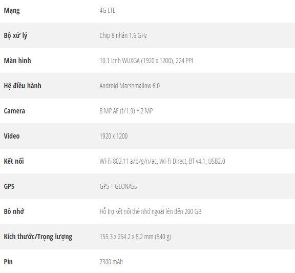 Điểm thú vị là Galaxy Tab A6 10,1 inch là sản phẩm được chạy hệ điều hành Android 6.0 mới nhất, hỗ trợ kết nối 4G LTE. Máy ảnh chính có độ phân giải 8 MP, khẩu độ f/1.9, máy ảnh trước độ phân giải 2 MP.