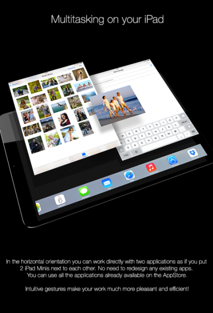Về giao diện, chúng ta không thấy nhiều sự khác biệt so với nền tảng iOS 7, nhưng có vẻ như nhà thiết kế đã đưa vào khả năng xử lý 2 ứng dụng trong cùng một thời điểm, một tính năng rất hay và phù hợp với kích thước đồ sộ 12.9 inch.