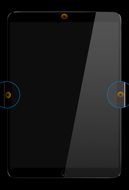 Bên cạnh đó, camera iPad Pro sẽ được nâng cấp lên với độ phân giải 8MP. Và thật thú vị khi nhà thiết kế đã đặt bộ phận cảm biến máy ảnh ra đằng sau logo trái táo, điều này sẽ khiến mặt sau chiếc iPad Pro trở nên liền mạch và tinh tế hơn. Hỗ trợ tối đa cho việc gọi thoại video 3D, Palo Alto đã bố trí đến 3 camera mặt trước ở 3 cạnh (cạnh trên, trái và phải).