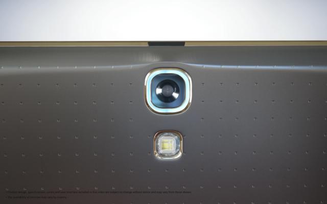 Như đã được thông cáo trước đó, mặt sau của dòng Tab S mới sẽ được trang bị mô hình “chấm” tương tự như của siêu phẩm hàng đầu - Galaxy S5 của hãng. Từ hình ảnh rò rỉ dưới đây, chúng ta có thể chiêm ngưỡng mặt sau của Tab S 10.5 (bao gồm cả camera mặt sau với đèn flash LED).