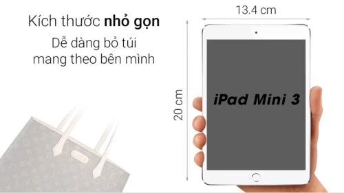 Kích thước 200 x 134.7 x 7.5 mm, trọng lượng 331 g. Có thể thấy kích thước và trọng lượng của Ipad mini 3 khá nhỏ so với những chiếc máy tính bảng cùng dòng giá khác. Nó rất tiện lợi để mọi người mang theo khi di chuyển và sử dụng trên tay mọi nơi.
