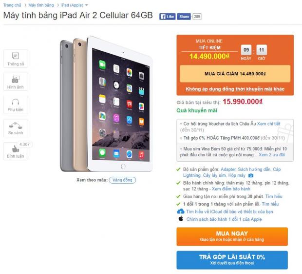 iPad Air 2 từng 1 thời chiếm lĩnh thị trường tablet cao cấp với độ mỏng đáng kinh ngạc chỉ có 6.1 mm cùng với cân nặng chỉ 444 gam. Tính đến thời điểm hiện tại, là 2 năm kể từ khi iPad Air 2 ra mắt, giá của sản phẩm này vẫn còn ở mức khá cao khoảng 15.99 triệu đồng dù iPad Air 3 đã được ra mắt. Mới đây, tại cửa hàng Thế giới di động vừa có 1 chương trình khuyến mãi áp dụng với khách hàng mua online sẽ được giảm ngay 1.5 triệu đồng đối với phiên bản 64 GB.