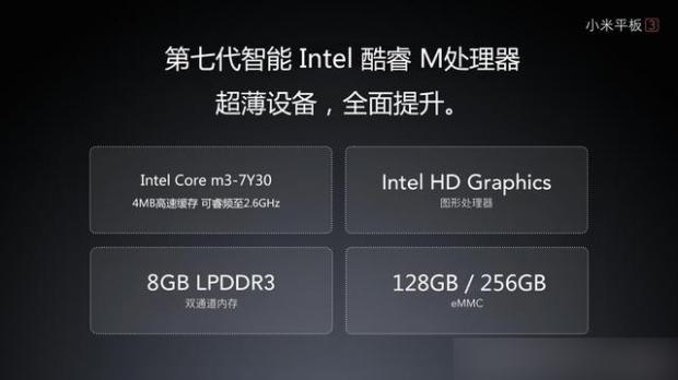 Về cấu hình, Xiaomi Mi Pad 3 sử dụng bộ vi xử lý Intel Core m3 – 7Y30 đi kèm GPU Intel HD Graphics. Máy có dung lượng RAM lên đến 8GB sử dụng công nghệ DDR3. Bộ nhớ trong của máy có 2 tùy chọn là 128GB và 256GB.