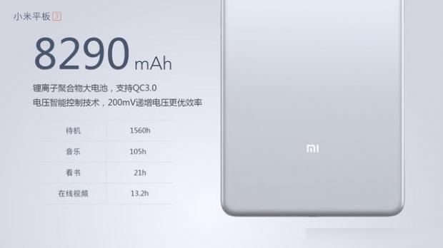 Xiaomi Mi Pad 3 có dung lượng pin là 8290 mAh, thiết bị này có thể xem phim liên tục trong 13,2 giờ, đọc sách trong 21h, nghe nhạc lên đến 105 giờ và đặc biệt là thời gian chờ của máy lên đến 1560 giờ ( khoảng 2 tháng). Dù không được trang bị vi xử lý của Qualcomm, tuy nhiên Mi Pad 3 vẫn được trang bị công nghệ sạc nhanh Quick Charge 3.0.