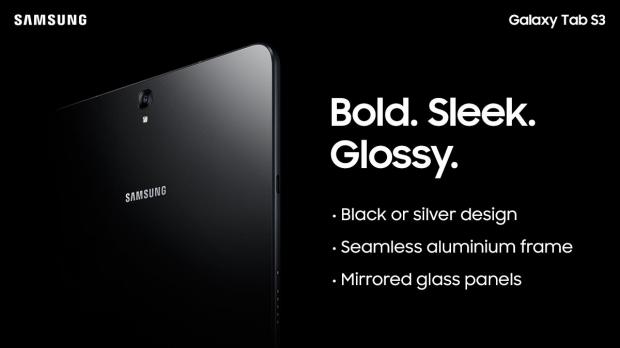 Galaxy Tab S3 sở hữu thiết kế cực kì sang trọng với độ mỏng chỉ 6mm. Bộ khung viền của máy được hoàn thiện từ kim loại, trong khi đó mặt lưng lại làm từ kính cường lực. Dù sở hữu ngoại hình hấp dẫn nhưng có lẽ việc cầm nắm Tab S3 sẽ khá khó khăn bởi mặt lưng trơn bóng và thiếu điểm tiếp xúc với tay người dùng.