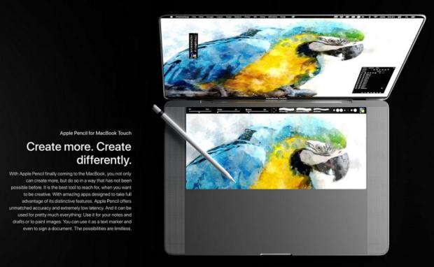 Ngoài ra bên hông cũng có những thay đổi nhỏ với dải kim loại đẹp mắt, làm tăng độ sang chảnh của chiếc MacBook Touch này lên gấp nhiều lần. Bên cạnh đó, người dùng còn có thể sử dụng bút Apple Pencil tương tác trực tiếp với máy thông qua bàn phím ảo khổng lồ trên thân máy.