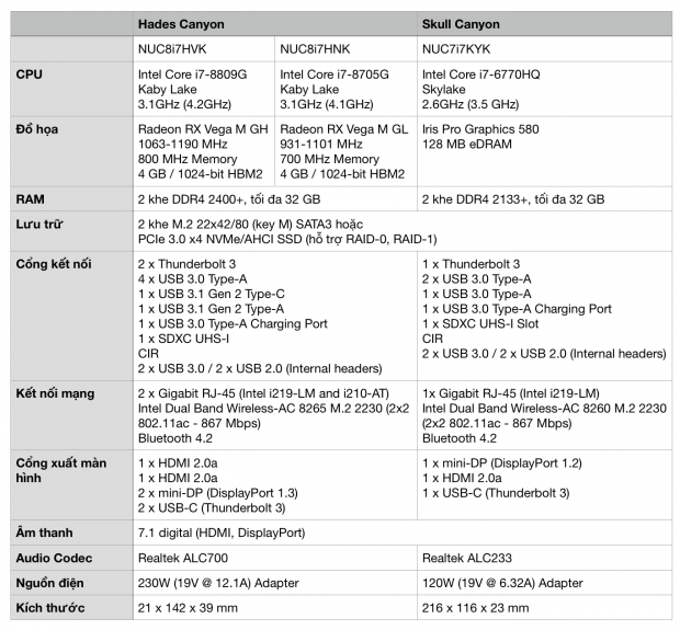 Mẫu Hades Canyon mạnh nhất có giá 999 USD, VR-ready, dùng CPU Core i7-8809G. Mẫu còn lại giá 799 USD dùng CPU Core-i7-8705G. Cả hai mẫu đều có hai khe RAM, hai khe M.2 và hàng loạt cổng kết nối được bố trí dày đặc ở hai mặt trước và sau của máy (cấu hình chi tiết như bên dưới).