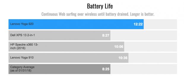 Đây là điểm sáng nhất trên chiếc Yoga 920, máy hoạt động liên tục tới 12 giờ 22 phút khi lướt web liên tục với wifi, với nhu cầu người dùng thông thường đây cũng là tác vụ chính hay sử dụng. Kết quả này cao hơn khá nhiều so với các đối thủ khác cũng như Yoga 910 trước đây.
