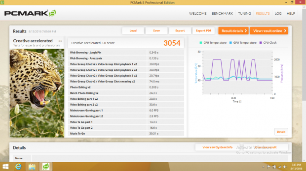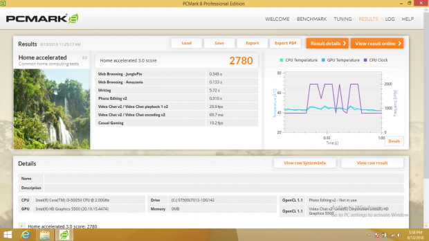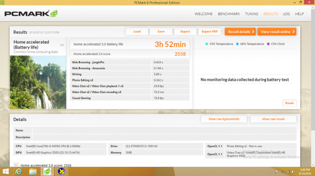 Để đánh giá thời lượng pin của ASUS X455LA-WX470D, mình dùng phần mềm PCMark 8, phép thử Home, máy chạy ở chế độ High Performance với độ sáng màn hình ở mức 40% (độ sáng mặc định khi sử dụng pin). Kết quả cho thấy máy hoạt động liên tục được khoảng 3 giờ 52 phút, một con số không quá cao, nhưng nhìn chung là khá ổn trong tầm giá.