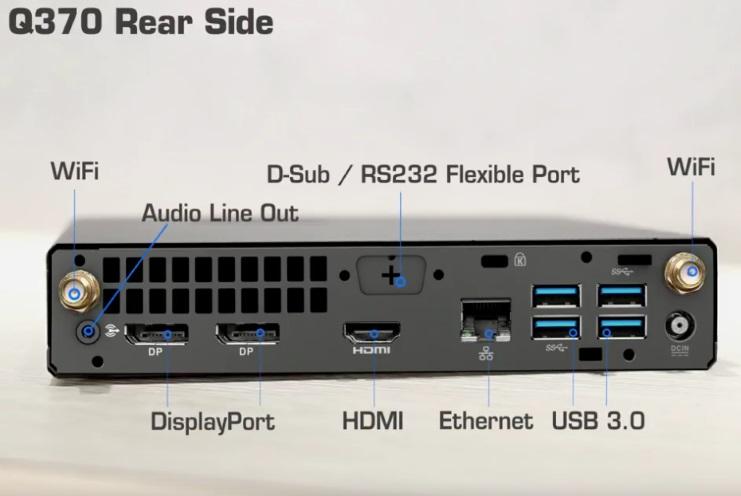 - Cổng kết nối mặt sau: 1x RS232, 1x VGA, 4x USB 2.0, 1x HDMI, 1x DisplayPort, 1x Gigabit Ethernet, 1x audio out, DC in