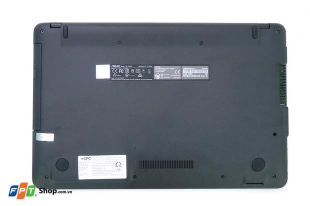 Mặt đáy của VivoBook X540SC có thiết kế đơn giản, tạo thành từ nhựa nhám với 4 gù cao su, khe hút nhiệt và một số tem ghi thông tin của sản phẩm.