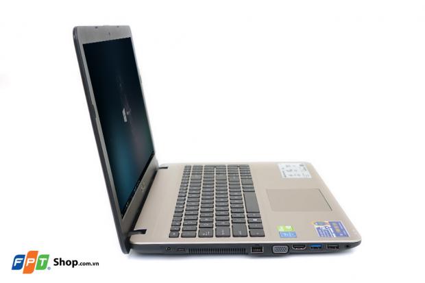Cạnh trái của ASUS VivoBook X540SC là nơi đặt cổng sạc, cổng USB Type C, khe tản nhiệt, cổng LAN (RJ45), cổng HDMI, cổng USB 3.0, cổng USB 2.0 và cổng tai nghe 3.5mm.