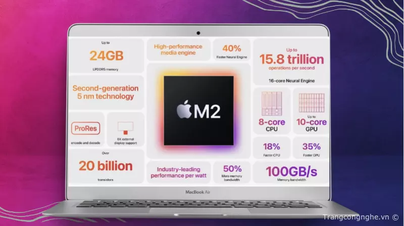 Macbook Air M2 là sản phẩm mới được nhà táo trình làng trong thời gian gần đây. Chỉ ra mắt trong thời gian ngắn nhưng Mac Air M2 đã trở thành tâm điểm, sản phẩm bán chạy nhất. Điều này không quá khó hiểu, Mac M2 được cập nhật nhiều tính năng cải tiến vượt trội, thiết kế hoàn hảo. Hãy cùng trangcongnghe.vn tìm hiểu kỹ chi tiết chiếc laptop cầm tay siêu tuyệt vời này để biết lý do tại sao bạn phải xuống tiền rinh ngay Macbook M2 về nhà.