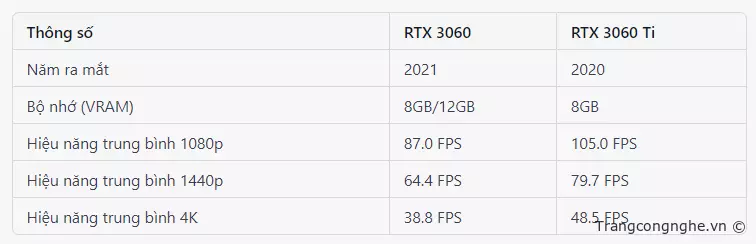 Bên cạnh đó, RTX 3060 Ti dù có VRAM thấp hơn nhưng lại cho hiệu suất vượt trội hơn. Điều này có thể do bus RAM cao hơn, giúp quá trình trao đổi dữ liệu nhanh chóng hỗ trợ GPU hoạt động tối đa.