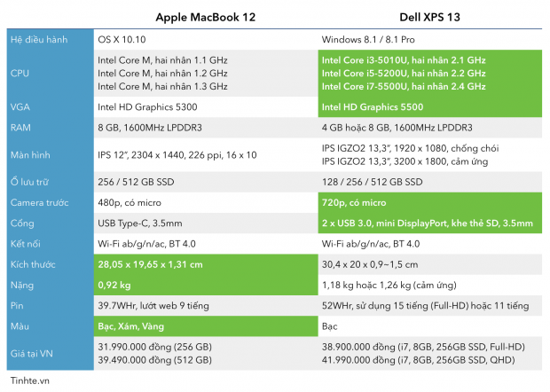 - MacBook 12 đẹp và nhỏ gọn hơn về thiết kế nhưng yếu hơn về cấu hình so với XPS 13.