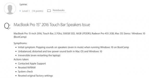 Như các bạn đã biết, người dùng có thể cài hệ điều hành Windows trên máy Mac thông qua công cụ chính chủ từ Apple mang tên Boot Camp. Quá trình cài đặt Windows qua Boot Camp rất dễ dàng. Phần mềm sẽ tự động cài đặt, phân vùng đĩa cứng, cài đặt Windows và cài đặt driver trên máy. Tuy nhiên, theo một số báo cáo gần đây, rất nhiều người dùng đã gặp vấn đề phần cứng nghiêm trọng sau khi cài đặt Windows 10 bằng Boot Camp lên máy tính Macbook Pro 2016. Cụ thể, khi người dùng chơi nhạc bằng các ứng dụng Windows, loa của MacBook Pro sẽ bị rè rất nhiều, thậm chí một bên loa cũng bị “nghẹt” âm. Khi người dùng khởi động trở lại sang Mac OS, máy vẫn gặp vấn đề trên.