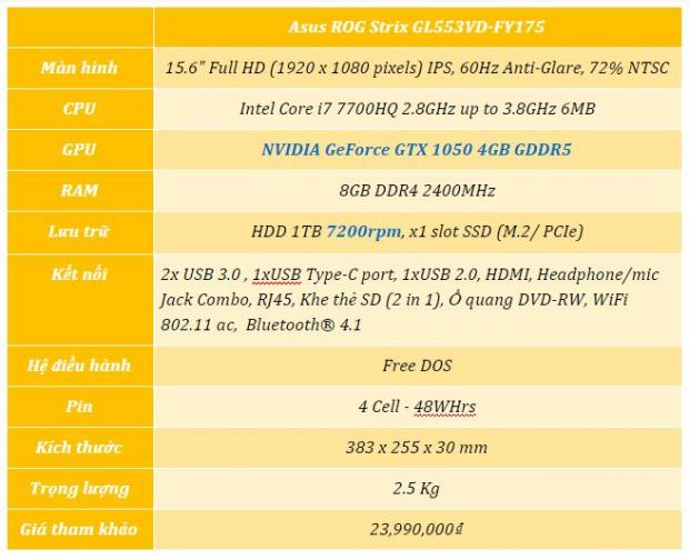 Đầu tiên hãy cùng tìm hiểu kỹ hơn về cấu hình của chiếc laptop mà mình cùng đánh giá. Phiên bản mình trên tay có tên mã đầy đủ là Asus GL553VD-FY305 và cấu hình chi tiết như sau: